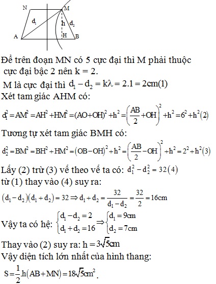Tại mặt nước có hai nguồn sóng A, B giống hệt nhau cách nhau 8cm, gọi M, N là hai điểm trên mặt nước sao cho và tạo với AB một hình thang cân (MN//AB), biết M, N dao động với biến độ cực đại. Bước sóng trên mặt nước là 1cm. Để trên đoạn MN có đúng 5 điểm dao động cực đại thì diện tích của hình thang phải là