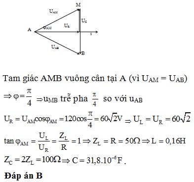 . Điện áp hiệu dụng UAM = 120V và uAM sớm pha so với uAB một góc