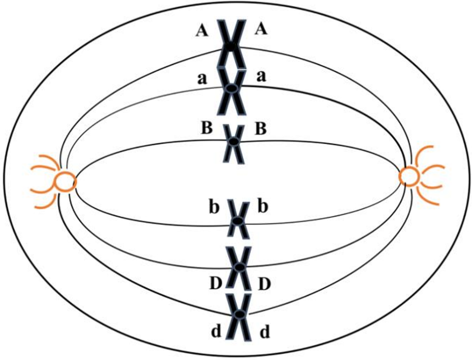 Hình dưới đây minh họa một giai đoạn phân bào bình thường của một tế bào trong cơ thể lưỡng bội. Các chữ cái A, a, B, b, D, d đại diện cho các nhiễm sắc thể, trong đó A, B, D lần lượt tương đồng với a, b, d.
