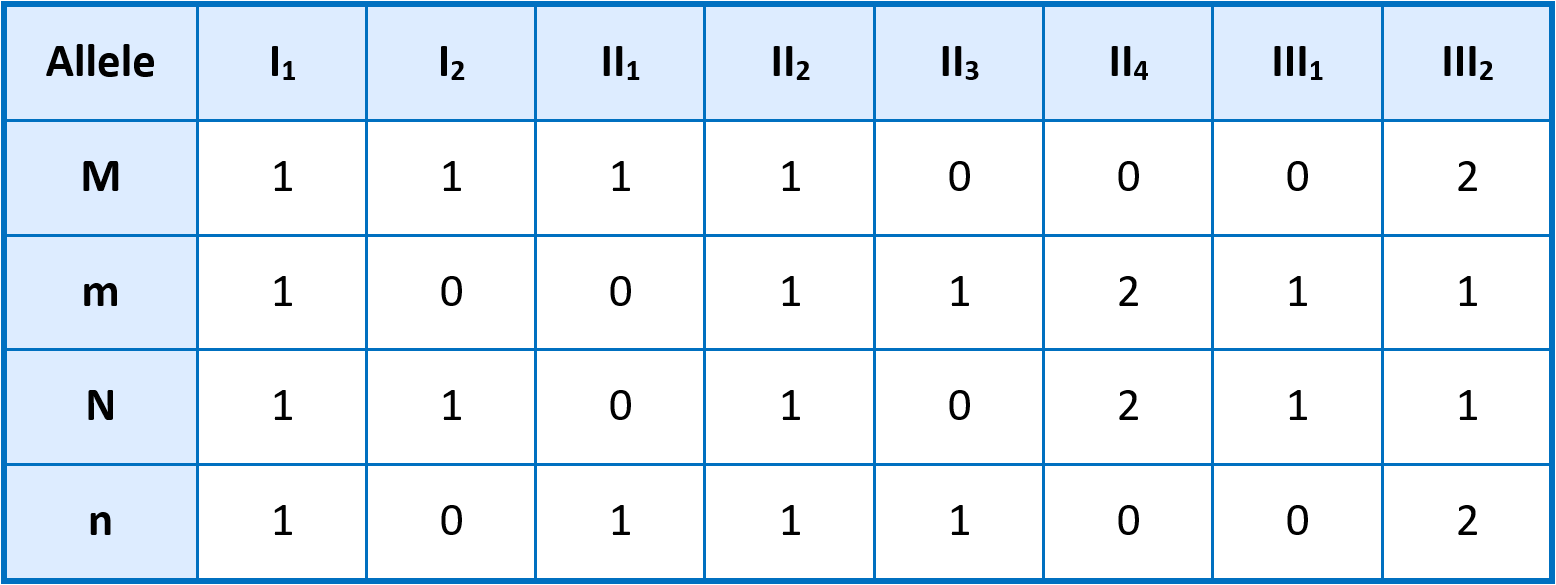 Một hội chứng bệnh ở người gây ra do có ba nhiễm sắc thể X (hội chứng XXX). Trên vùng không tương đồng của nhiễm sắc thể X có hai locus gene M, N liên kết hoàn toàn, mỗi locus có 2 allele khác nhau (kí hiệu lần lượt là M, m và N, n). Một gia đình có hai bố mẹ bình thường sinh được một con trai và một con gái đều bình thường. Con gái của họ kết hôn và sinh được một người con bị mắc hội chứng XXX, con trai của họ lấy vợ sinh được một con trai bình thường. Kết quả phân tích DNA các allele của những người trong gia đình này thể hiện ở bảng dưới đây. Biết rằng kí hiệu I1, I2 là cặp bố mẹ thế hệ đầu tiên của gia đình này, các kí hiệu từ II1 tới III2 là các cá thể còn lại thuộc các thế hệ tương ứng, các chữ số trong bảng là số lượng allele tương ứng có trong mỗi cá thể.