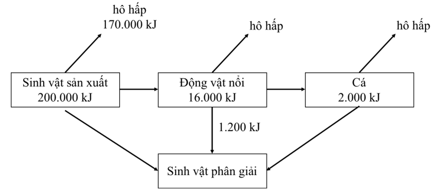 Hình dưới đây biểu diễn sự chuyển hoá năng lượng qua một chuỗi thức ăn trong một hệ sinh thái hồ nước.