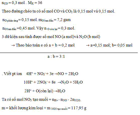 Hỗn hợp M gồm Al, Al2O3, Fe3O4, CuO, Fe và Cu, trong đó oxi chiếm 20,4255% khối lượng hỗn hợp. Cho 6,72 lít khí CO (đktc) đi qua 35,25 gam M nung nóng, sau một thời gian thu được hỗn hợp rắn N và hỗn hợp khí X có tỉ khối so với H2 bằng 18. Hòa tan hết toàn bộ N trong lượng dư dung dịch HNO3 loãng. Sau khi các phản ứng xảy ra hoàn toàn, thu được dung dịch chứa m gam muối (không có muối NH4NO3 sinh ra) và 4,48 lít (đktc) hỗn hợp khí Z gồm NO và N2O. Tỉ khối của Z so với H2 là 16,75. Giá trị của m là