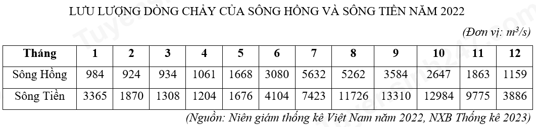 Căn cứ vào bảng số liệu trên, hãy cho biết năm 2022, tổng lưu lượng dòng chảy của sông Tiền gấp mấy lần tổng lưu lượng dòng chảy của sông Hồng? (làm tròn kết quả đến một chữ số thập phân).