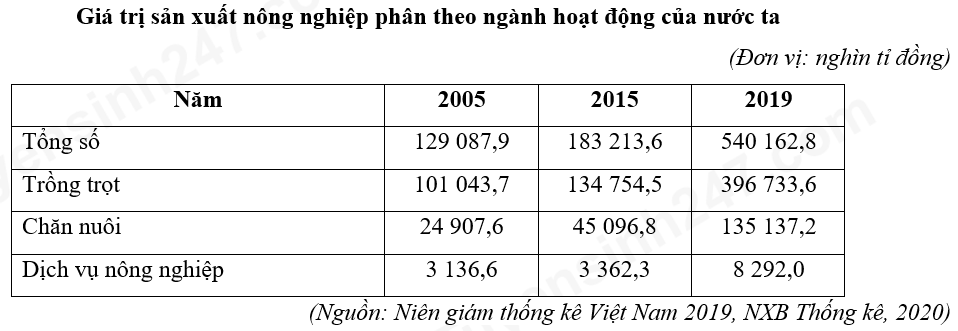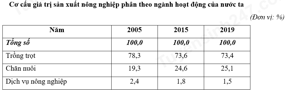 Lập bảng cơ cấu giá trị sản xuất nông nghiệp phân theo ngành hoạt động của nước ta giai đoạn 2005 – 2019.