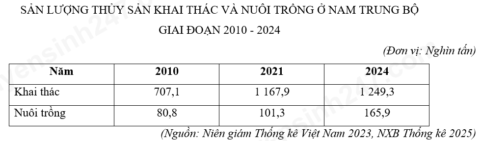 Dựa vào bảng số liệu và lựa chọn nhận xét không đúng về sự thay đổi sản lượng thủy sản khai thác và nuôi trồng ở Nam Trung Bộ, giai đoạn 2010 - 2024.