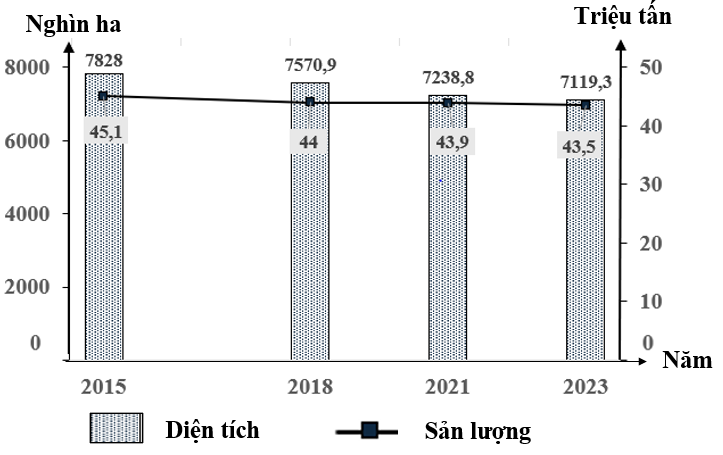 Cho biểu đồ:DIỆN TÍCH GIEO TRỒNG VÀ SẢN LƯỢNG LÚA CỦA NƯỚC TA GIAI ĐOẠN 2015 - 2023 (Nguồn: