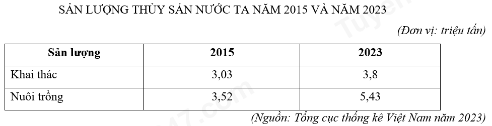 Dựa vào bảng số liệu trên, hãy cho biết tỉ trọng sản lượng thủy sản nuôi trồng của nước ta năm 2023 so với năm 2015 tăng thêm bao nhiêu phần trăm? (làm tròn kết quả đến một chữ số thập phân).