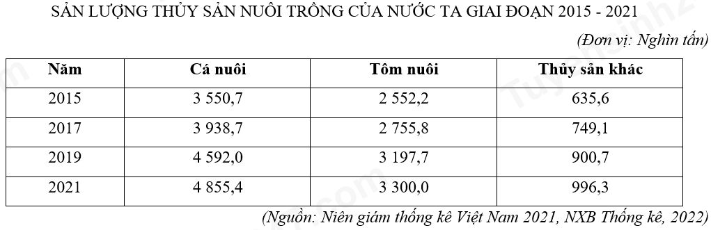 Dựa vào bảng số liệu, hãy cho biết loại thuỷ sản nào tăng chậm nhất trong sản lượng thuỷ sản nuôi trồng của nước ta giai đoạn 2015 – 2021?