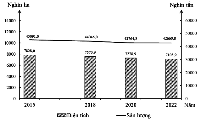 Cho biểu đồ về diện tích và sản lượng lúa nước ta giai đoạn 2015 - 2022: