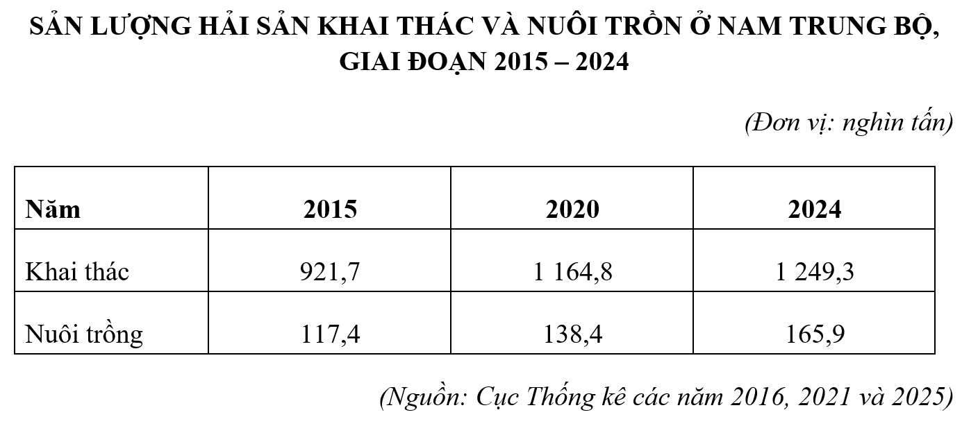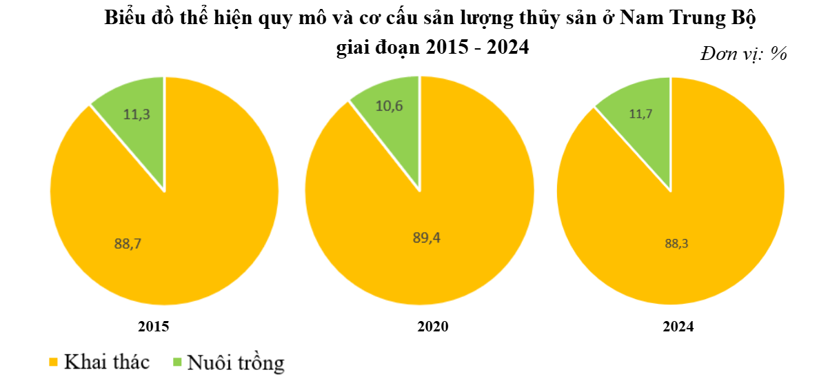 - Xác định biểu đồ thể hiện quy mô và cơ cấu sản lượng thủy sản ở Nam Trung Bộ giai đoạn 2015 - 2024 => Vẽ biểu đồ tròn (đầy đủ nội dung như tên biểu đồ, chú giải,…)