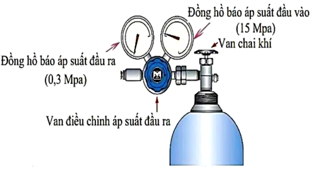 Bình oxy y tế là một thiết bị dùng cho những người bệnh có bệnh lý về đường hô hấp. Do khí oxy trong bình có áp suất lớn nên để bệnh nhân có thể sử dụng được ta phải giảm áp suất khí oxy. Coi nhiệt độ khí không thay đổi. Hình bên mô tả van điều áp ở bình oxy y tế. Nếu liều lượng khí oxy bệnh nhân sử dụng được chỉ định là 5 lít/phút thì lưu lượng khí oxy đầu vào trước khi giảm áp là