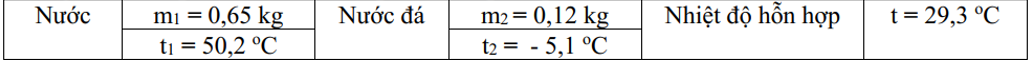 | c) Bỏ qua sự trao đổi nhiệt với môi trường và với bình. Nhiệt nóng chảy riêng của nước đá đo được theo thí nghiệm trên là $3,6.10^{5}J/kg$. | ||