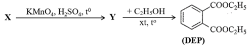 Phân tích thành phần nguyên tố của X thấy X chứa 90,57% carbon về khối lượng. Tỉ khối hơi của X so với H2 nhỏ hơn 75. Từ X tổng hợp được diethylphtalate (DEP) dùng làm thuốc điều trị bệnh ghẻ và giảm triệu chứng sưng tấy ở vùng da bị côn trùng cắn,… theo sơ đồ sau: