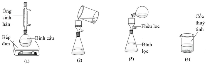Các bộ dụng cụ đã sử dụng tương ứng với các bước khi tiến hành tinh chế chất hữu cơ X bằng phương pháp kết tinh được cho ở các hình dưới đây: