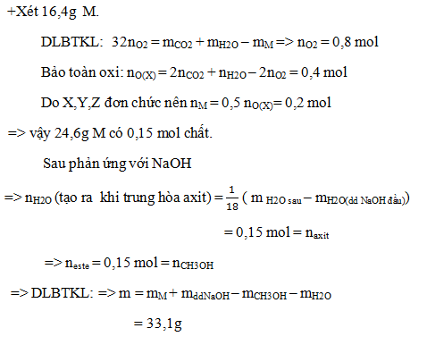 Đốt cháy hoàn toàn 16,4 gam hỗn hợp M gồm hai axit cacboxylic đơn chức X, Y và một este đơn chức Z, thu được 0,75 mol CO2 và 0,5 mol H2O. Mặt khác, cho 24,6 gam hỗn hợp M trên tác dụng hết với 160 gam dung dịch NaOH 10%. Sau khi các phản ứng xảy ra hoàn toàn, thu được dung dịch N. Cô cạn toàn bộ dung dịch N, thu được m gam chất rắn khan; CH3OH và 146,7 gam H2O. Coi H2O bay hơi không đáng kể trong phản ứng của M với dung dịch NaOH. Giá trị của m là