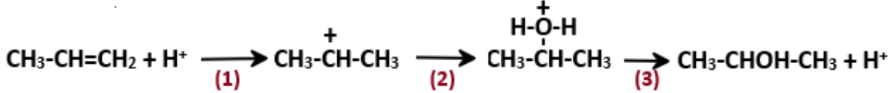 Cho cơ chế phản ứng của propene với H2O như sau, ở mỗi giai đoạn được đánh số thứ tự tương ứng (1), (2), (3):