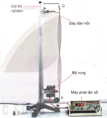 Tốc độ truyền sóng trên các sợi dây kim loại khi kéo căng có thể lên đến hàng trăm m/s. Do đó, chúng ta không thể đo tốc độ này với độ chính xác cao bằng các dụng cụ đo quãng đường và thời gian. Thay vào đó, người ta thực hiện thí nghiệm sóng dừng trên sợi dây này để xác định tốc độ truyền sóng với độ chính xác cao hơn. Hình bên mô tả một bộ thí nghiệm tạo sóng dừng trên dây. Một sợi dây PQ dài 2 m, đầu P gắn với cần rung có tần số thay đổi được và được coi là nút sóng, đầu Q cố định. Điều chỉnh tần số để trên dây PQ có sóng dừng. Sau đó, cho tần số tăng thêm 40 Hz thì thấy rằng số nút sóng trên dây tăng thêm 5 nút. Tốc độ truyền sóng trên dây PQ lúc này là