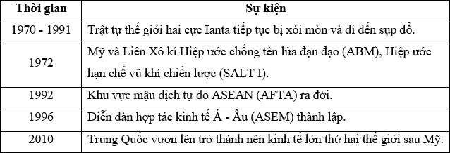 | a) Một trong những nguyên nhân sụp đổ trật tự thể giới hai cực lanta là tác động của xu thế toàn cầu hóa và ảnh hưởng của cuộc cách mạng công nghiệp lần thứ 3. | ||