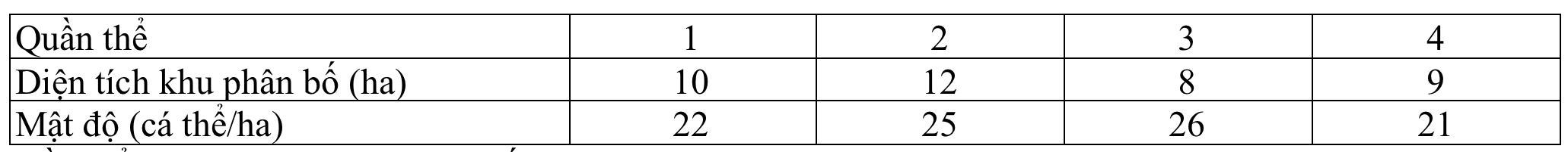 Giả sử 4 quần thể của một loài thú được kí hiệu là 1, 2, 3, 4 có diện tích khu phân bố và mật độ cá thể như sau: