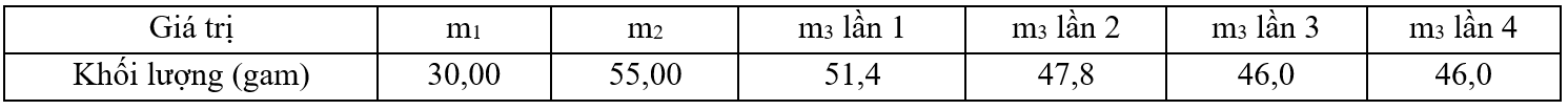 Bước 4: Để nguội, cân lại chén nung cùng chất rắn còn lại bên trong, ghi khối lượng và kết quả là m3 gam. Tiếp tục nung và cân chén giống như bước 3 và bước 4 cho đến khi thấy khối lượng không thay đổi và kết quả thí nghiệm của nhóm học sinh được ghi vào bảng sau.