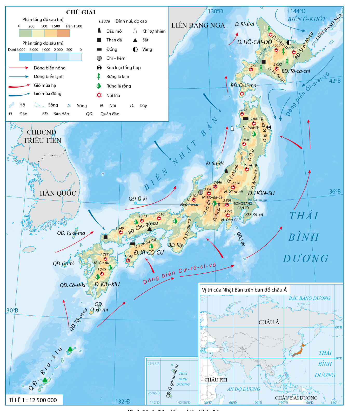 Cho bản đồ sau và trả lời 3 câu hỏi bên dưới:Bản đồ tự nhiên Nhật