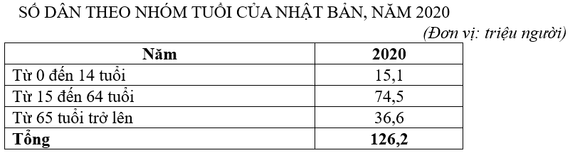 Căn cứ vào bảng số liệu trên, hãy cho biết nhóm dân số nào có tỉ trọng cao nhất trong cơ cấu dân số của Nhật Bản năm 2020?