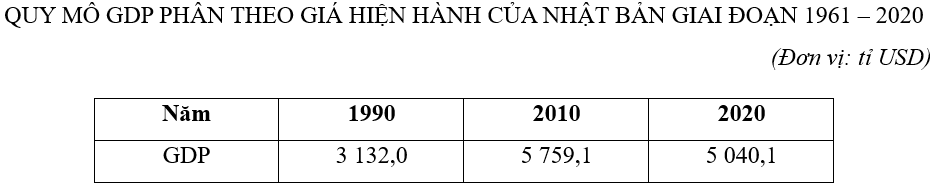 Cho bảng số liệu:GDP của Nhật Bản năm 2020 gấp bao nhiêu lần GDP năm 1990? (Làm tròn đến số