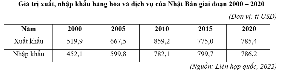 Cho bảng số liệu:Theo bảng số liệu, giá trị xuất siêu của Nhật Bản cao nhất vào năm