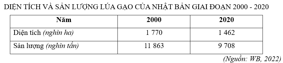 Dựa vào bảng số liệu trên, hãy cho biết diện tích hay sản lượng lúa gạo của Nhật Bản giảm nhanh hơn?