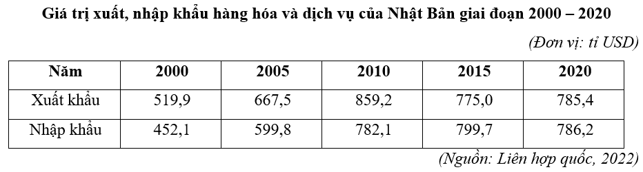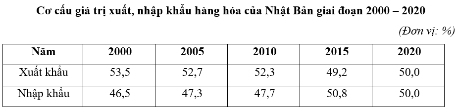 - Nhận xét: dựa vào bảng số liệu vừa tính, nhận xét về sự thay đổi cơ cấu giá trị xuất, nhập khẩu của Nhật Bản giai đoạn 2000 - 2020.