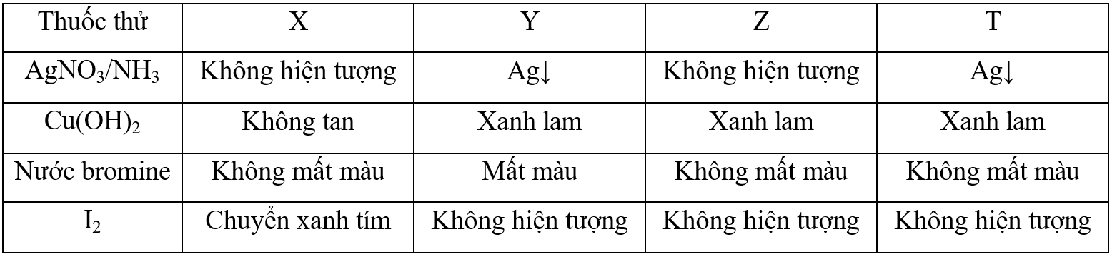 Bảng dưới đây ghi lại hiện tượng khi làm thí nghiệm với các chất glucose, fructose, saccharose, amylose ở dạng dung dịch với dung môi nước được kí hiệu ngẫu nhiên không theo thứ tự là X, Y, Z, T: