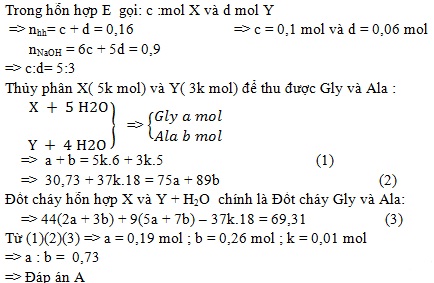 Đun nóng 0,16 mol hỗn hợp E gồm hai peptit X (CxHyOzN6) và Y (CnHmO6Nt) cần dùng 600 ml dung dịch NaOH 1,5M chỉ thu được dung dịch chứa a mol muối của glyxin và b mol muối của alanin. Mặt khác đốt cháy 30,73 gam E trong O2 vừa đủ thu được hỗn hợp CO2, H2O và N2, trong đó tổng khối lượng của CO2 và nước là 69,31 gam. Giá trị a : b gần nhất với