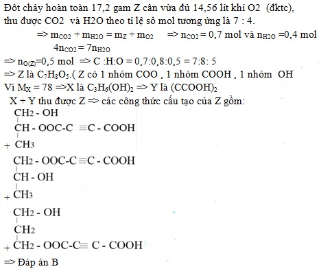Ancol X (MX= 76) tác dụng với axit cacboxylic Y thu được hợp chất Z mạch hở (X và Y đều chỉ có một loại nhóm chức). Đốt cháy hoàn toàn 17,2 gam Z cần vừa đủ 14,56 lít khí O2 (đktc), thu được CO2 và H2O theo tỉ lệ số mol tương ứng là 7 : 4. Mặt khác, 17,2 gam Z lại phản ứng vừa đủ với 8 gam NaOH trong dung dịch. Biết Z có công thức phân tử trùng với công thức đơn giản nhất. Số công thức cấu tạo của Z thỏa mãn là