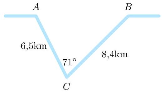 Một tàu vận tải đang di chuyển trên Đại Tây Dương thì có cảnh báo băng trôi phía trước nên đã di chuyển như hình vẽ. Nếu đi thẳng từ $A$ đến $B$ thì quang đường ngắn lại bao nhiêu km (làm tròn kết quả đến hàng phần mười)?