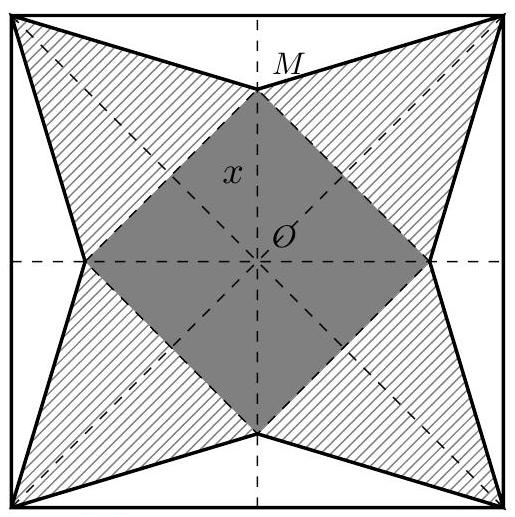 Cắt một miếng bìa giấy hình vuông và xếp thành một hình chóp tứ giác đều như hình bên. Biết cạnh hình vuông bằng $20\text{cm},OM = x\text{cm}$. Tìm $x$ để hình chóp đều ấy có thể tích lớn nhất.