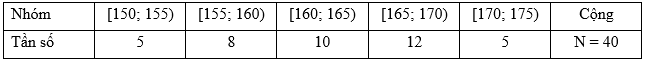 1) Một nhà may thống kê chiều cao (đơn vị: centimét) của 40 học sinh của một lớp 9 để may đồng phục. Sau khi ghép nhóm mẫu số liệu thu được, nhà may nhận được bảng tần số ghép nhóm như sau: