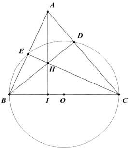 b) Chứng minh \(A B \cdot A E=A C \cdot A D\) và \(A H \perp B C\).