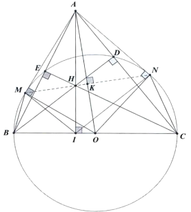 2) Cho tam giác ABC nhọn. Đường tròn \((O)\) đường kính BC cắt AB, AC lần lượt tại E và D; BD cắt CE tại H. Từ A kẻ tiếp tuyến AM, AN của đường tròn (O) (M, N là các tiếp điểm).