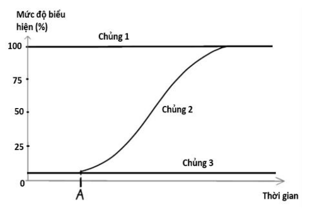 Hình bên mô tả kết quả xác định mức biểu hiện của gene Z mã hóa enzyme - galactosidase ở 3 chủng E. coli đột biến trong điều kiện môi trường nuôi cấy ban đầu không có lactose và bổ sung một lượng nhất định lactose được vào thời điểm A.