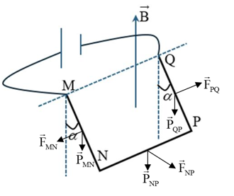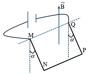 Một thanh dẫn đồng chất, tiết diện đều, trọng lượng $P$ được uốn thành khung dây gấp khúc gồm ba đoạn bằng nhau $MN = NP = PQ = 16,0\text{~cm}$. Khung dây được treo sao cho có thể quay quanh trục nằm ngang đi qua hai đầu $M$ và $Q$. Hai đoạn MN và PQ song song với nhau và cùng vuông góc với đoạn NP. Đặt hệ thống vào một từ trường đều có vecto cảm ứng từ hướng thẳng đứng lên trên, độ lớn $B = 0,50\text{~T}$. Khi có dòng điện cường độ $I = 4,00\text{~A}$ chạy qua khung dây thì khung dây lệch khỏi mặt phẳng thẳng đứng sao cho các đoạn MN, PQ hợp với phương thẳng đứng một góc $\alpha$ với $\cos\alpha = 0,80$. Bỏ qua lực ma sát ở trục quay.