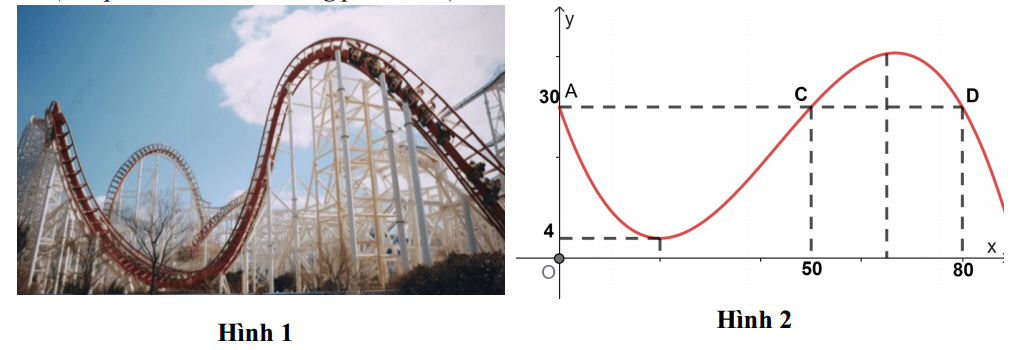 Biết đường chạy của nó là một phần đồ thị hàm số bậc ba $y = ax^{3} + bx^{2} + cx + d$ $\left( {0 \leq x < 90} \right)$; tàu lượn siêu tốc xuất phát từ điểm A, đi qua các điểm C, D (ba điểm A, C, D nằm trên đường thẳng song song với trục Ox) đồng thời đạt độ cao nhỏ nhất so với mặt đất là 4 m. Độ cao lớn nhất mà tàu lượng siêu tốc đạt được là bao nhiêu mét so với mặt đất? (kết quả làm tròn đến hàng phần chục).