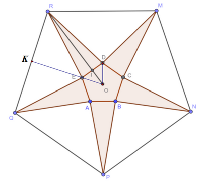 Có một tấm bìa hình ngũ giác đều MNPQR tâm O cạnh bằng 30 cm, cắt bỏ 5 tam giác cân bằng nhau có cạnh đáy là cạnh của ngũ giác đều ban đầu, đỉnh là đỉnh của ngũ giác đều bên trong như hình vẽ rồi gập lên thành một khối chóp ngũ giác đều có cạnh đáy bằng x (cm). Tìm x để thể tích tạo thành là lớn nhất.