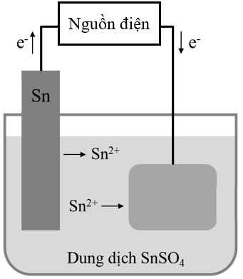 Tiến hành một thí nghiệm mạ thiếc một mảnh thép có tổng diện tích 200 cm2 với cường độ dòng điện I = 1 A, độ dày mong muốn là 0,01 mm. Người ta lắp sơ đồ điện phân như hình dưới và giả thuyết thời gian điện phân là dưới 2400 giây.