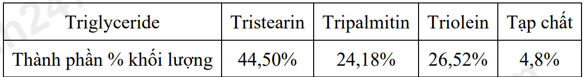 Một loại chất béo có chứa thành phần như sau: (Trong tạp chất không chứa