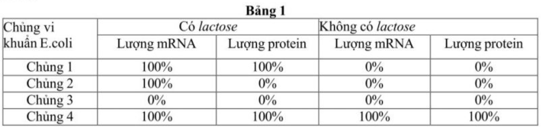 Bảng 1 mô tả hàm lượng mRNA và protein tương đối của gene Z thuộc operon Lac ở các chủng vi khuẩn E. coli trong môi trường có hoặc không có Lactose. Biết rằng chủng 1 là chủng bình thường, các chủng 2, 3, 4 là các chủng đột biến phát sinh từ chủng 1, mỗi chủng bị đột biến ở một vị trí duy nhất trong operon Lac.