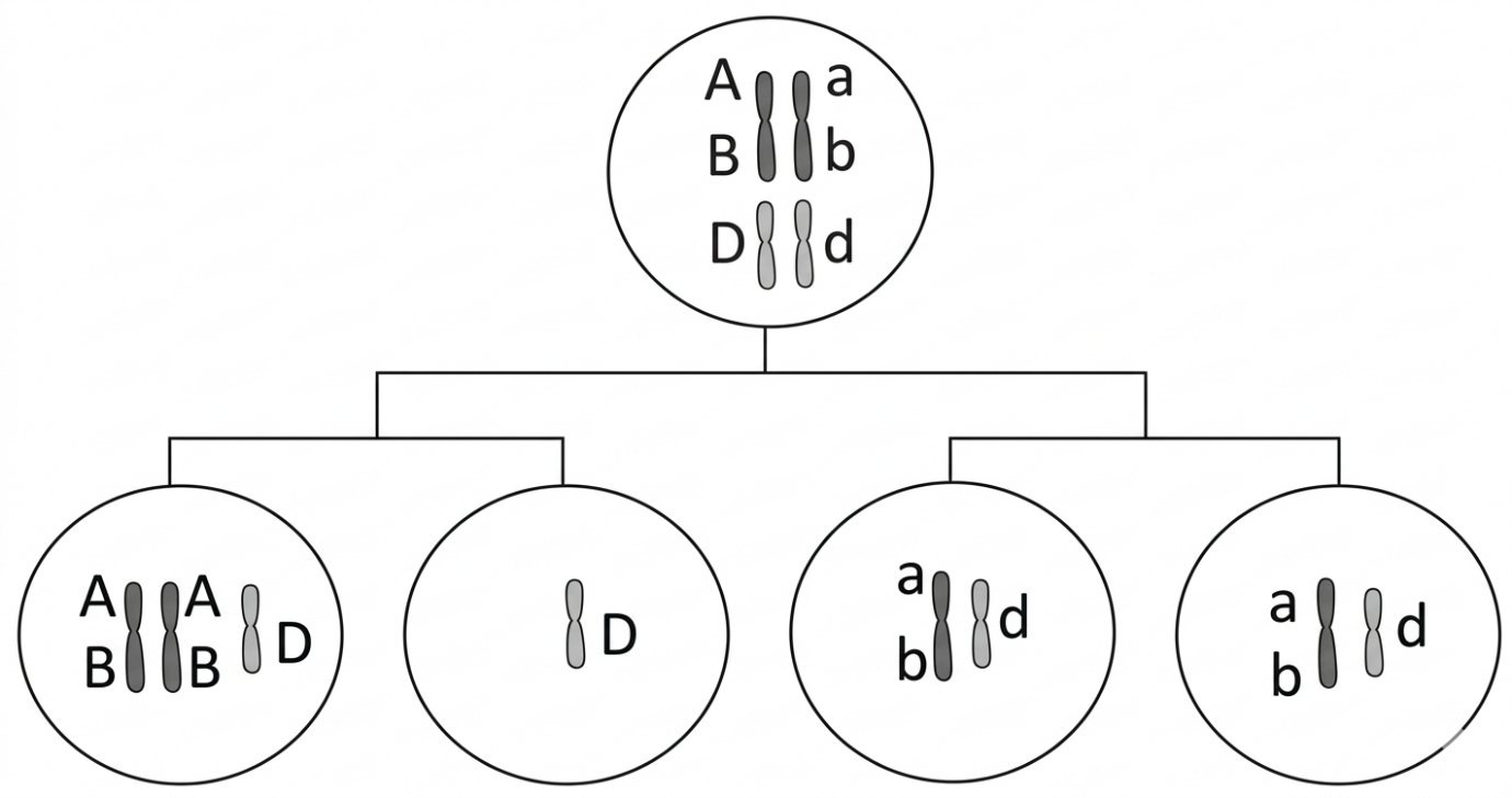Hình dưới đây cho thấy 1 tế bào sinh tinh có 2 cặp NST đã giảm phân cho ra 4 giao tử. Theo lí thuyết, nhận định nào sau đây là sai?