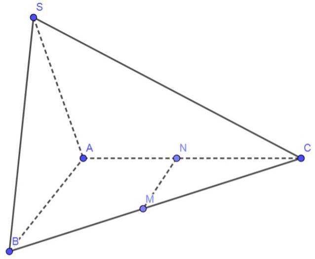 Cho hình chóp $S.ABC$ có đáy là tam giác vuông cân đỉnh $A$ với cạnh góc vuông bằng $a$, tam giác $SAB$ cân đỉnh $S$ và nằm trong mặt phẳng vuông góc với đáy. Gọi $M,N$ lần lượt là trung điểm của $BC$ và $AC$. Khoảng cách giữa hai đường thẳng $MN$ và $SB$ là