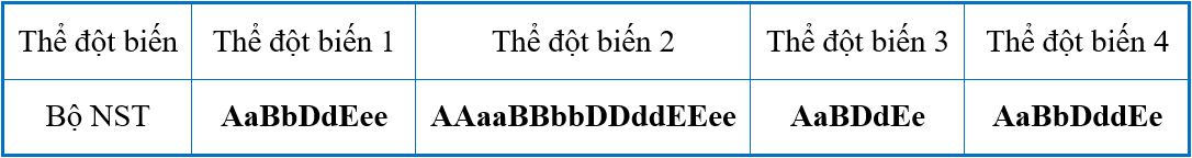 Ở một loài thực vật lưỡng bội có 4 cặp NST được kí hiệu lần lượt là Aa, Bb, Dd, Ee. Giả sử có 4 thể đột biến với số lượng NST như sau: