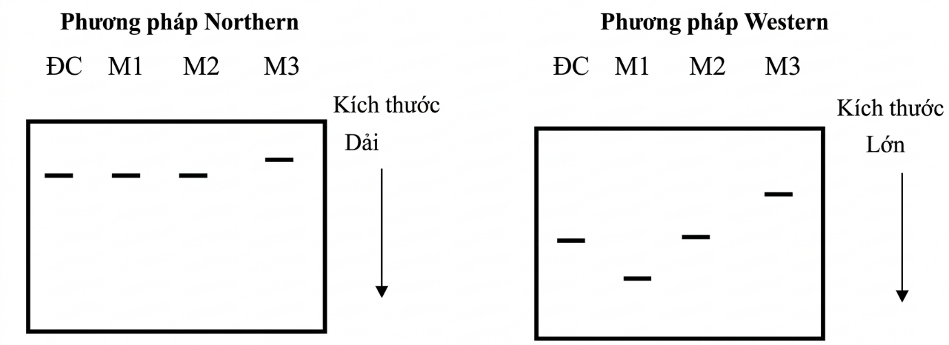 Có 3 loại đột biến xảy ra ở cùng một gene ký hiệu các thể đột biến này lần lượt là M1, M2 và M3. Để xác định các dạng đột biến trên thuộc loại nào người ta dùng phương pháp Northern (phân tích RNA) và Western (phân tích protein). Kết quả phân tích mRNA và protein của các thể đột biến và kiểu dại (ĐC) bằng hai phương pháp trên thu được như hình dưới đây.