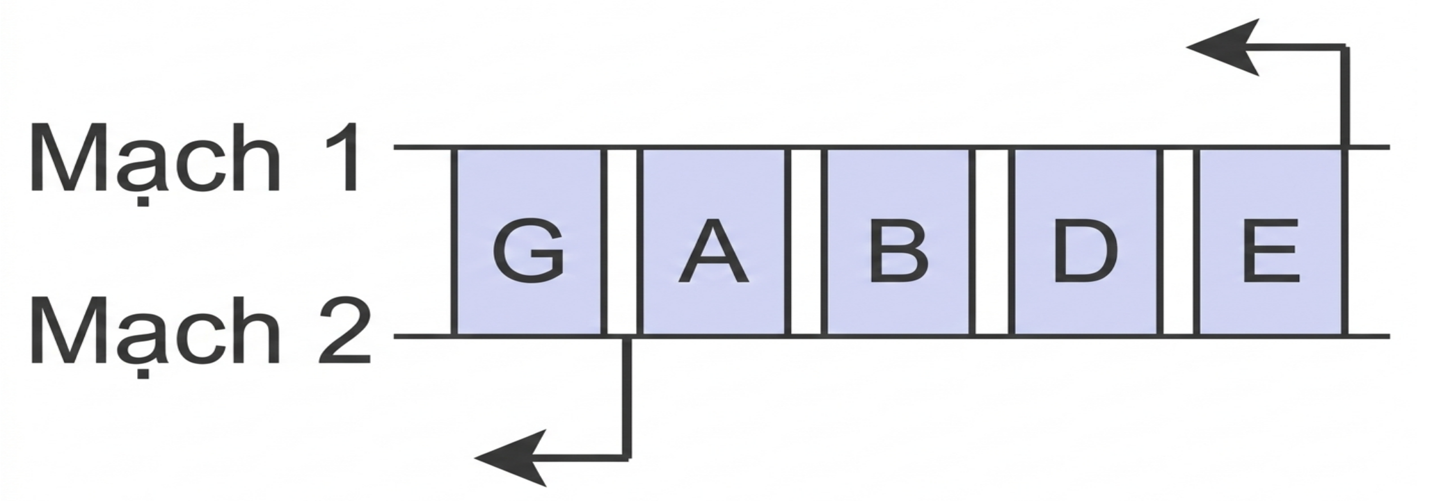 Ở vi khuẩn E. coli, xét một đoạn phân tử DNA có 5 gene G, A, B, D, E. Trong đó có 4 gene A, B, D, E thuộc cùng một operon. Chiều mũi tên chỉ chiều phiên mã của mỗi gene.